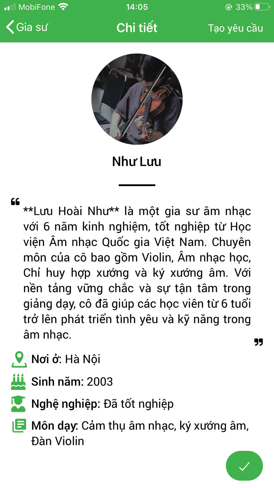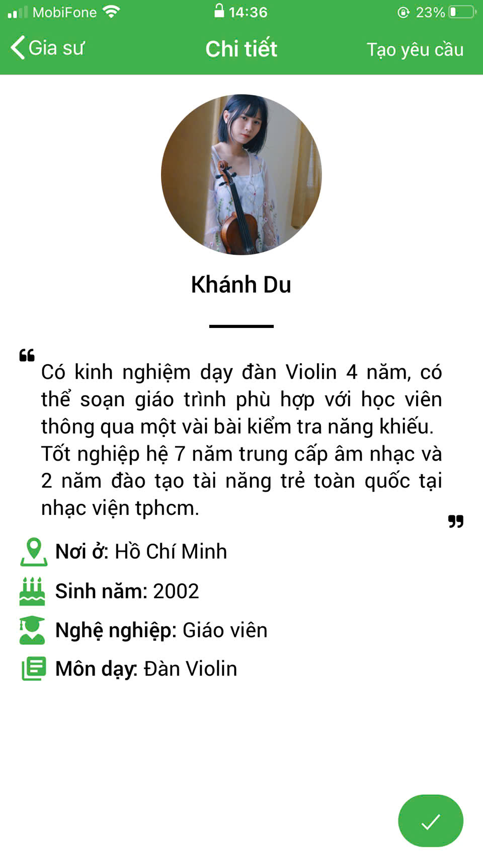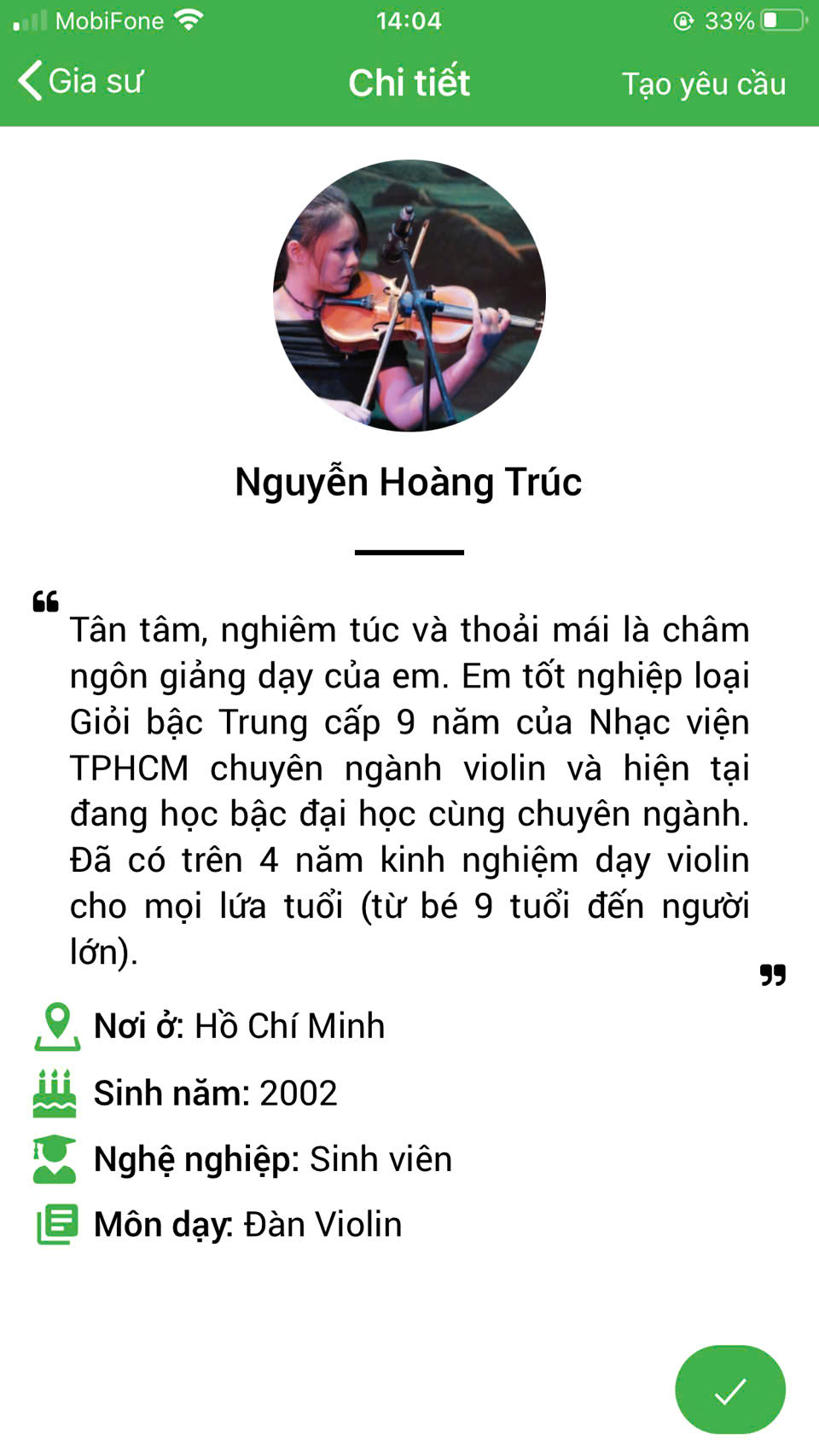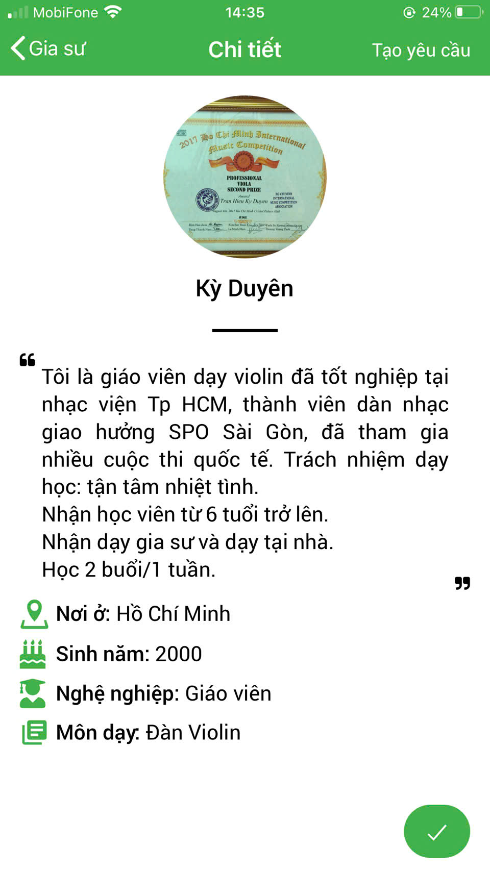 XEM THÊM NHIỀU PROFILE GIA SƯ DẠY ĐÀN VIOLIN TẠI HỆ THỐNG DAYKEMTAINHA.VN >>