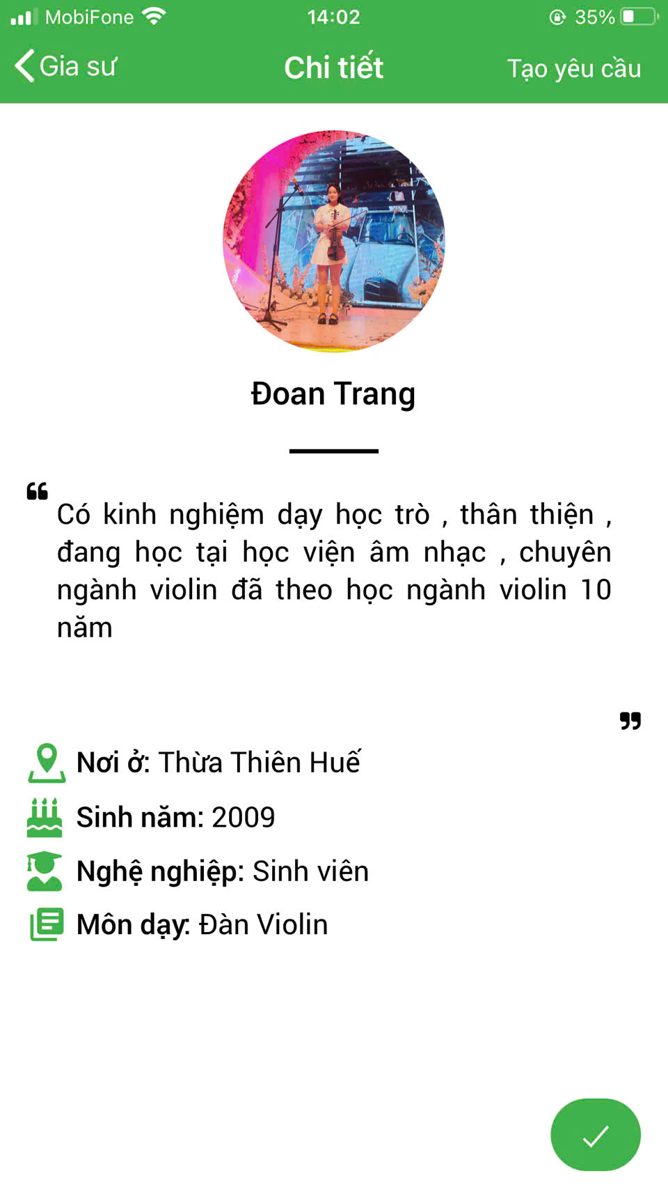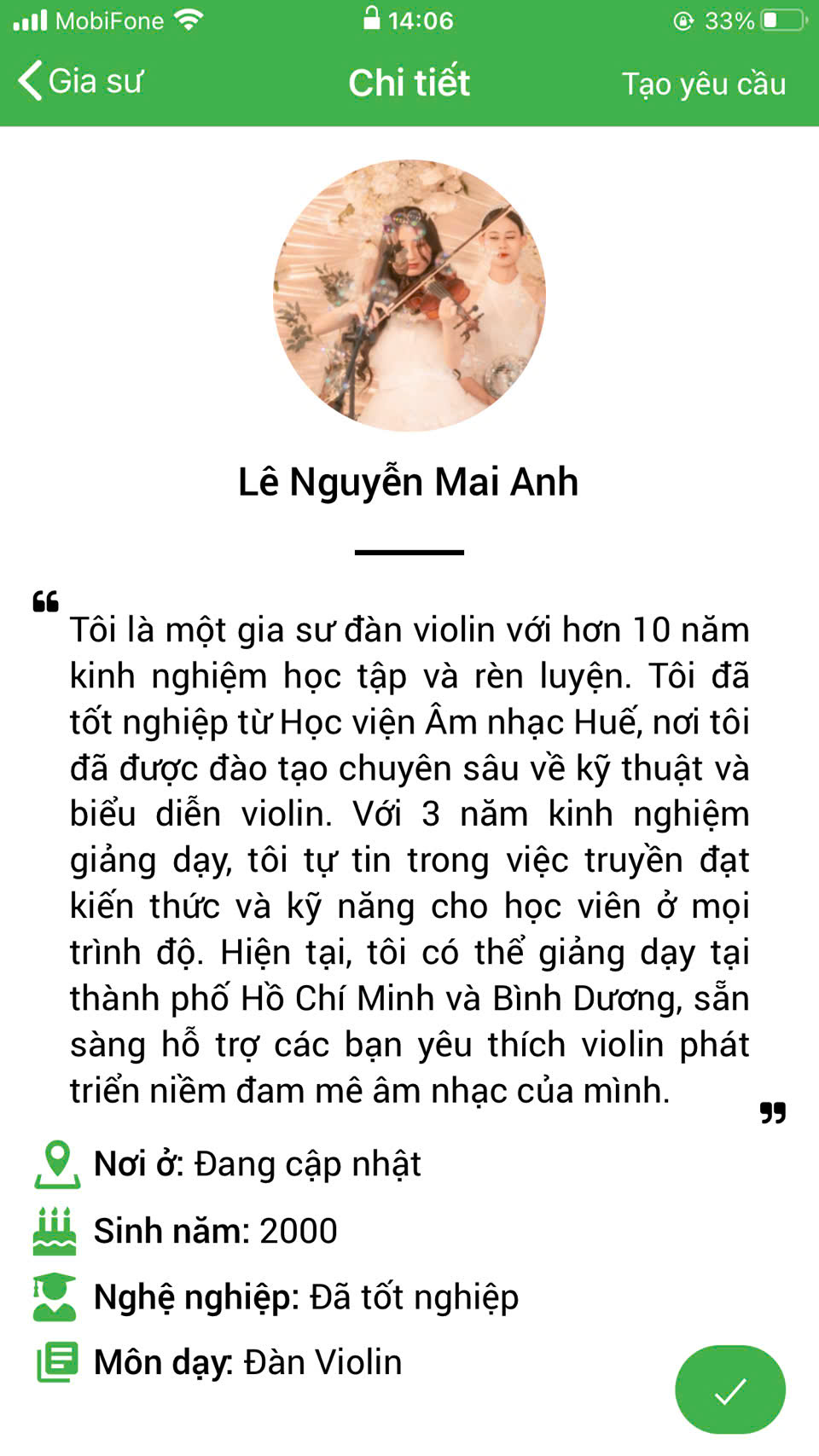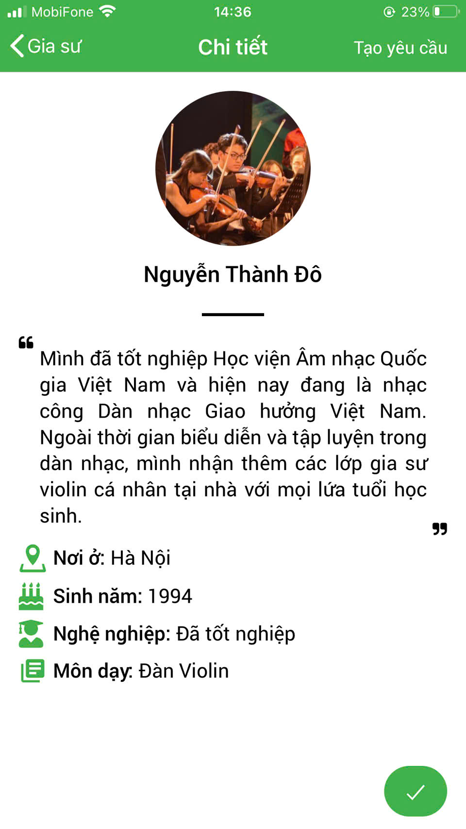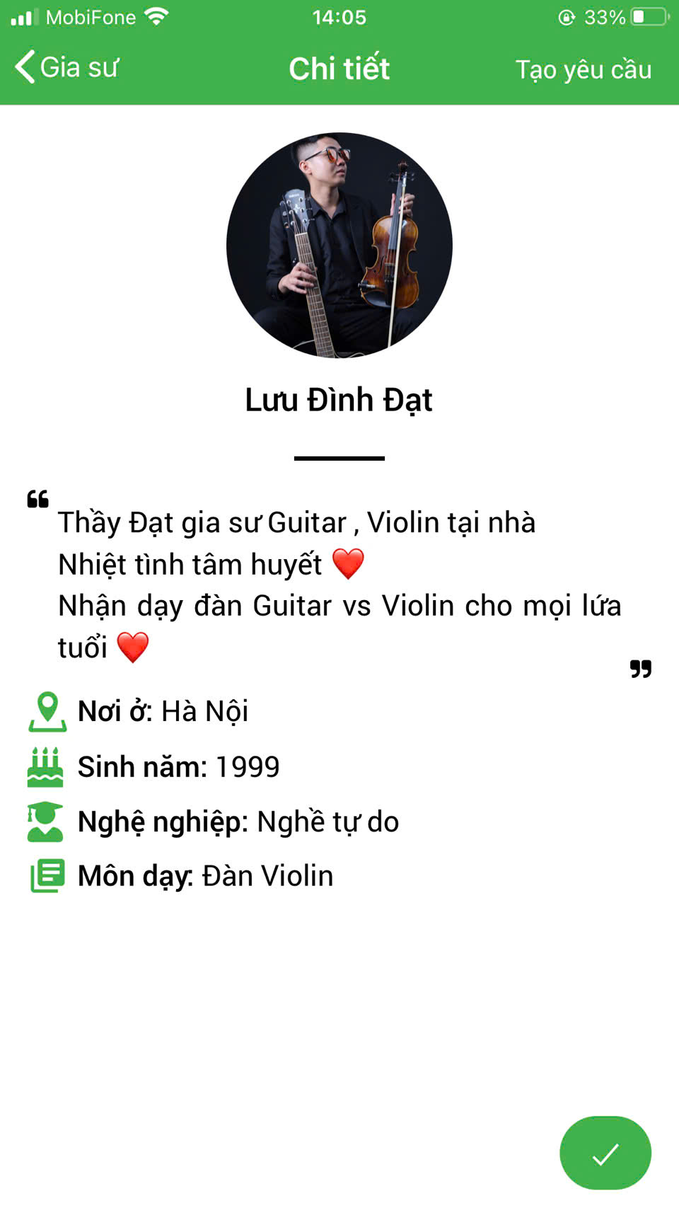 XEM THÊM NHIỀU PROFILE GIA SƯ DẠY ĐÀN VIOLIN TẠI HỆ THỐNG DAYKEMTAINHA.VN >>