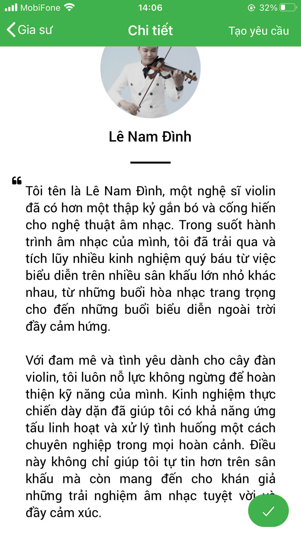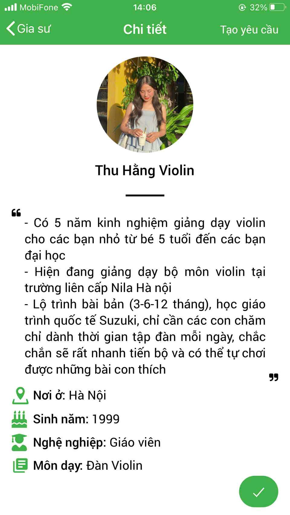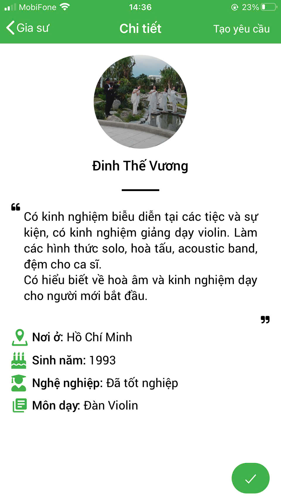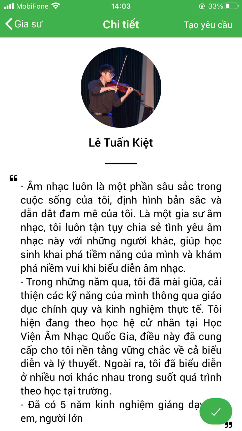 XEM THÊM NHIỀU PROFILE GIA SƯ DẠY ĐÀN VIOLIN TẠI HỆ THỐNG DAYKEMTAINHA.VN >>